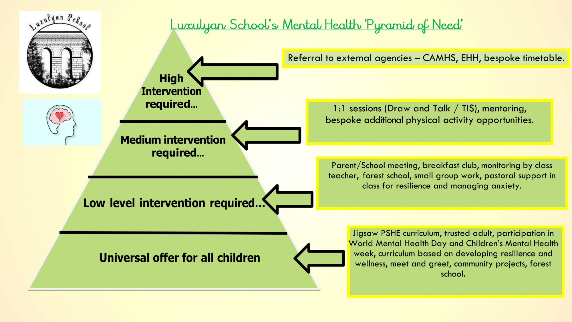 Our 'Pyramid of need' details the support and interventions we provide to support pupils with their mental health and wellbeing.